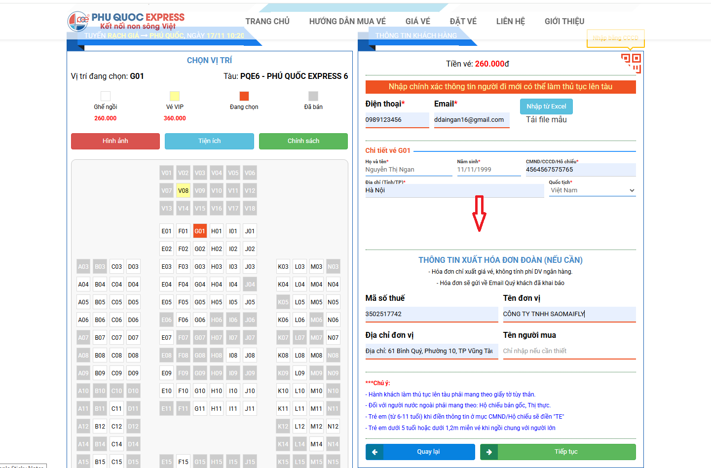 Quan trọng điền thông tin “Xuất hoá đơn”: Sau khi điền thông tin khách hàng, hành khách sẽ thấy có phần "xuất hoá đơn" như trong hình vẽ bên dưới.