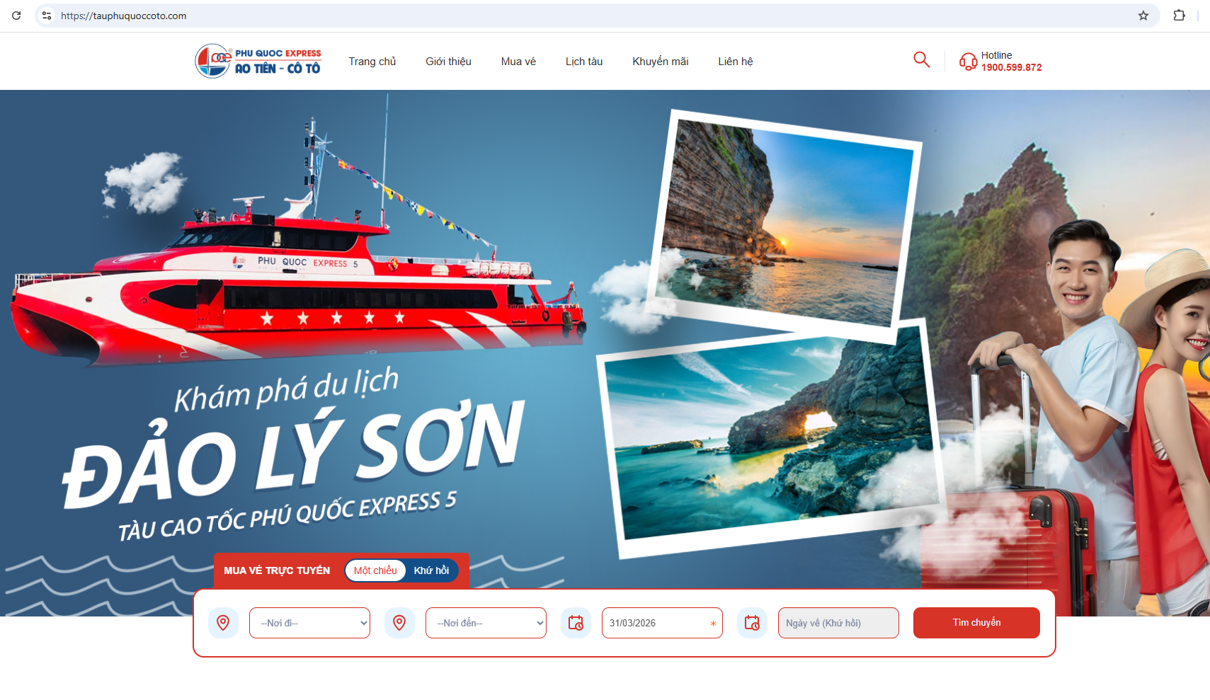Truy cập https://online.taucaotocphuquoc.com/ và chọn hành trình: Nơi đi (Sa Kỳ ) - nơi đến (Lý Sơn) - thời gian đi và về - tìm chuyến. Sau đó lựa chọn chuyến tàu Phú Quốc Express có thời gian khởi hành phù hợp.